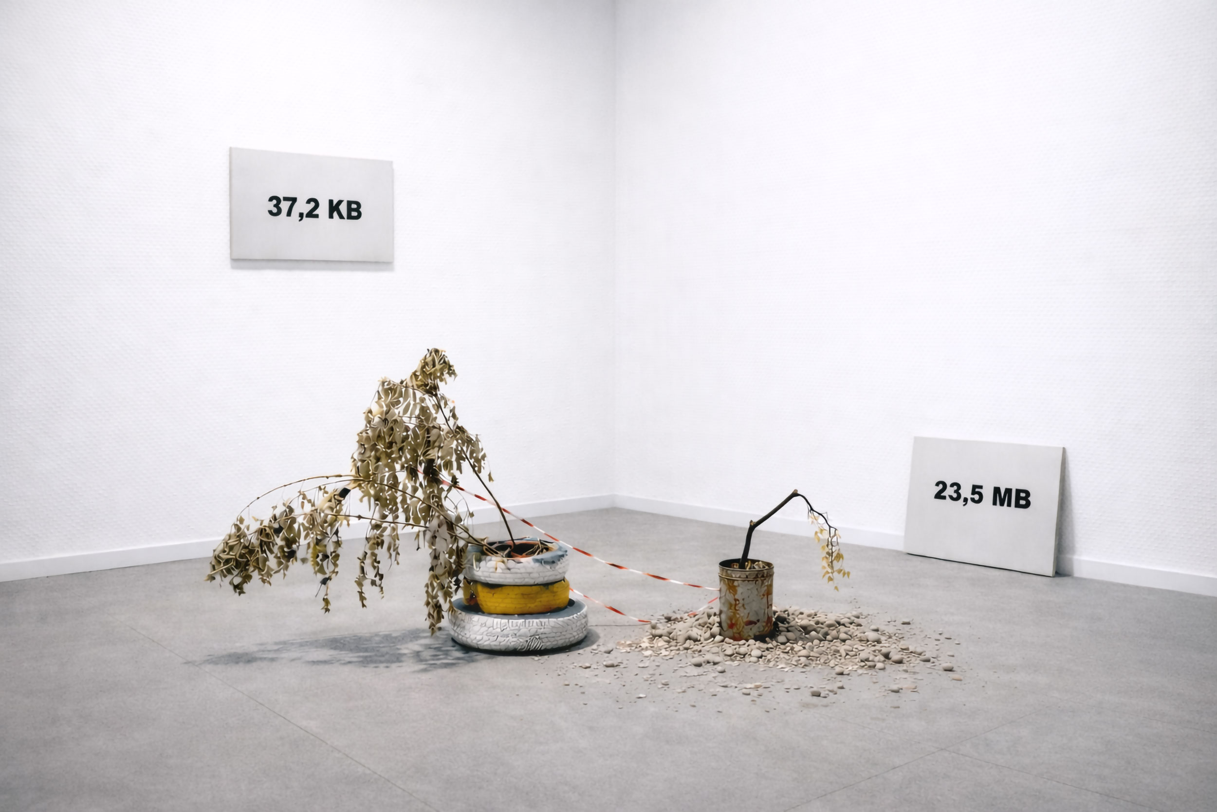 Marcello Mercado transfers this logic into the gallery space, but shifts it from the physical territory to the territory of image and information. Here there is no longer a pothole in the street. What has disappeared is the image itself. The two white surfaces on the wall do not contain the digital weight of any particular photograph, document, or representation. They only display two quantities: “37.2 KB” and “23.5 MB.” These figures function as remains and material indicators of something that was there, or might have been there. Digital weight has taken the place of the image.