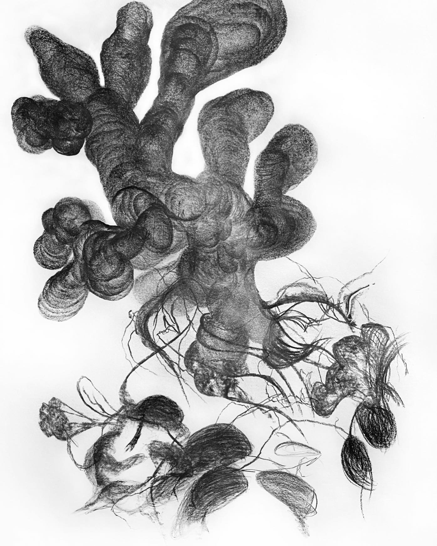 Within Mercado’s broader practice this gesture signals a recurring operation: the translation of abstract systems of thought into physical processes where information is metabolized, decomposed, and redistributed through living matter.