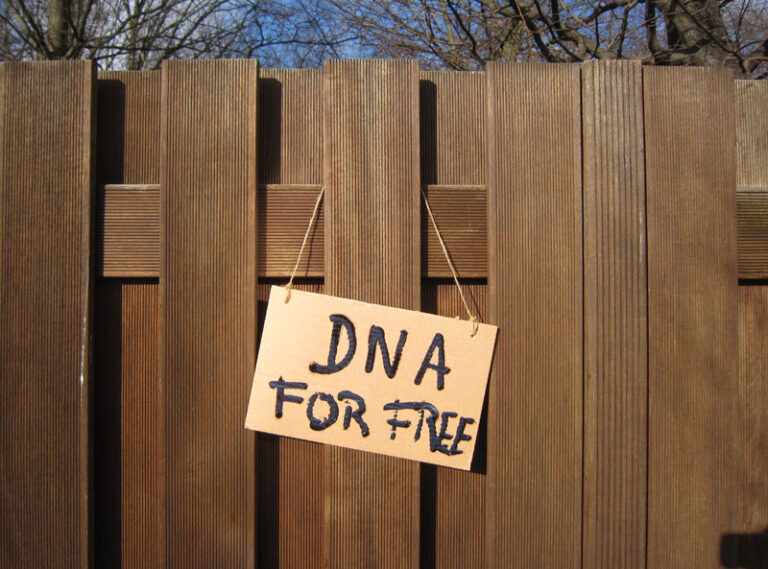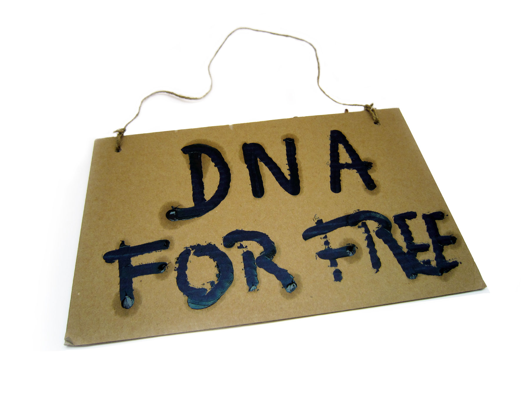 A hand-painted cardboard sign offers the artist’s DNA as freely available material. The work reverses contemporary regimes of genetic ownership and intellectual property, presenting genetic identity as something that can circulate without restriction.