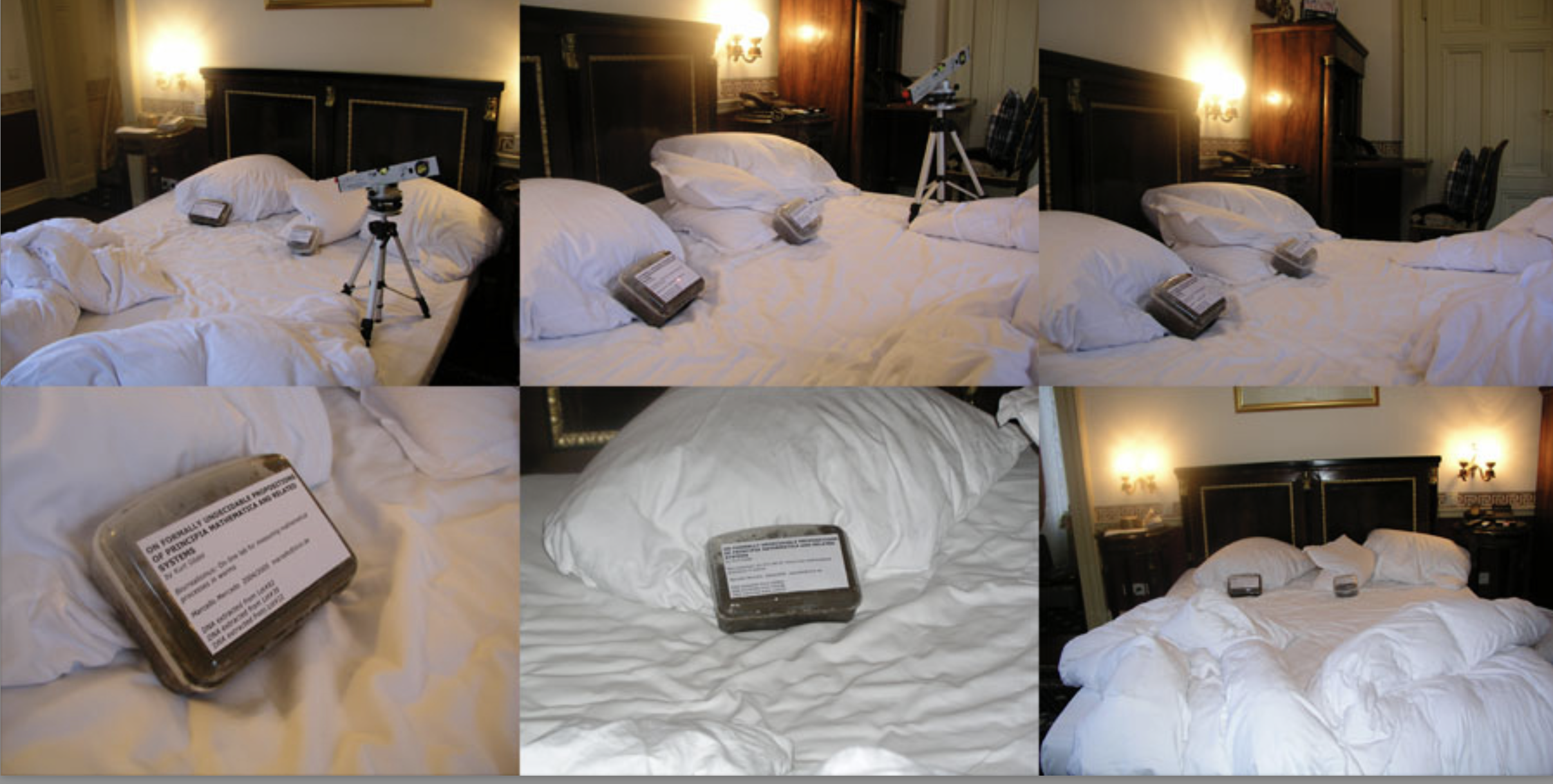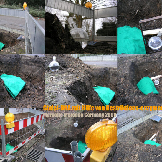 After reading texts related to Kurt Gödel’s incompleteness theorems, the artist dilutes his DNA in distilled water and pours it into an urban excavation created for street construction. Logical systems, biological material and urban infrastructure intersect in the action.
