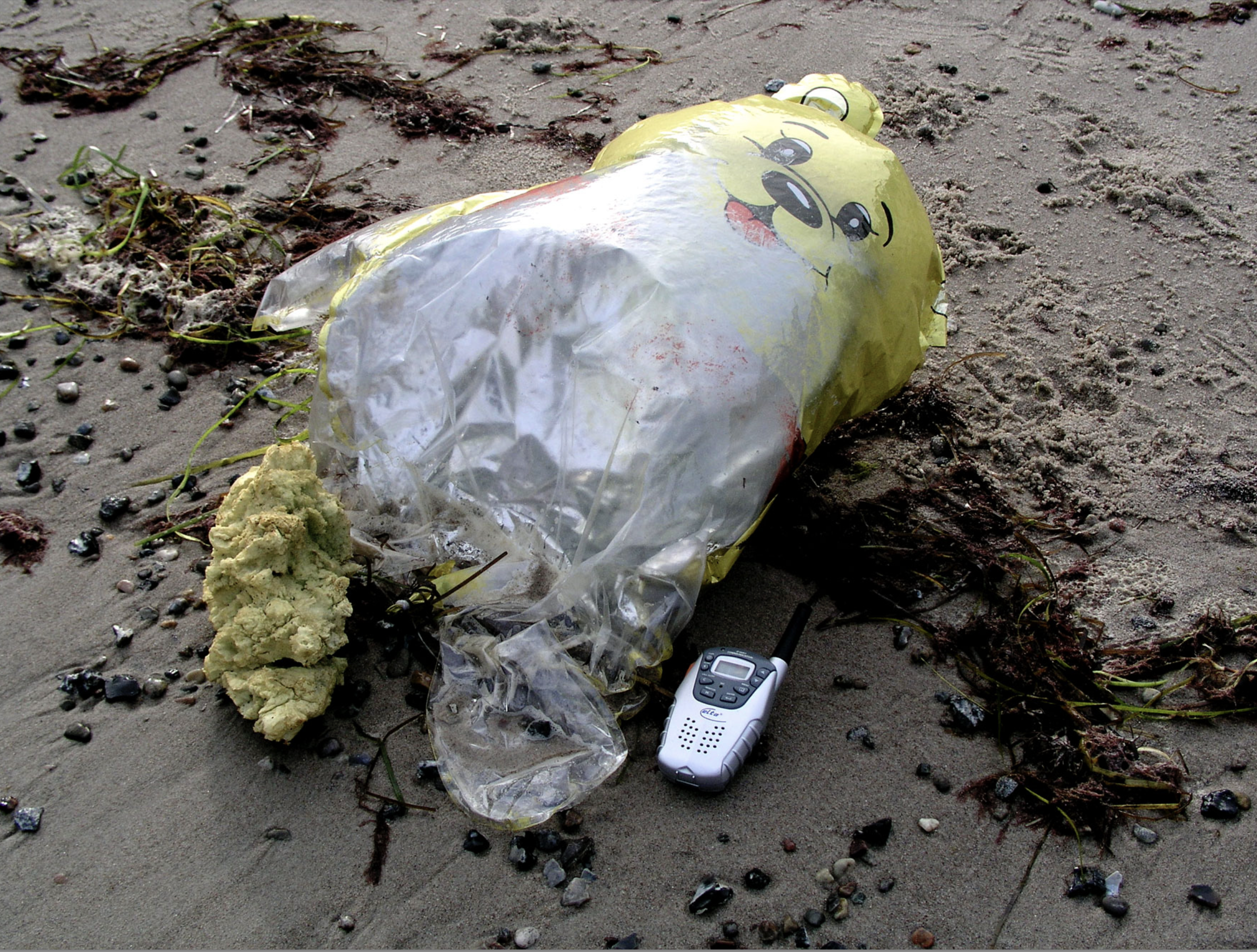 The action took place on a coastal area in Denmark. A discarded inflatable plastic object, partially deflated and washed ashore, was placed on the sand. Next to it the artist positioned a portable walkie-talkie radio device.