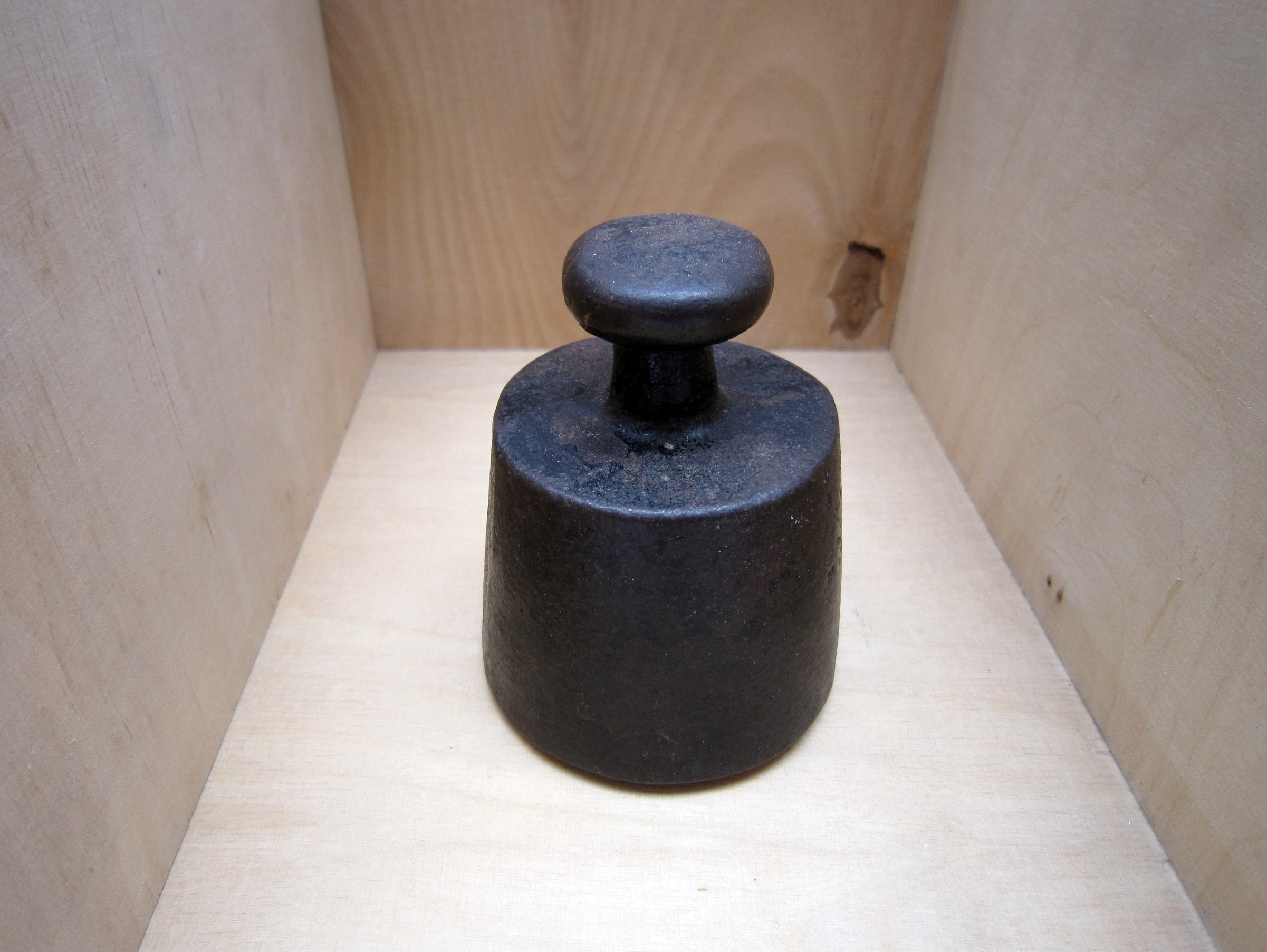 A small sample of DNA is placed beneath an iron weight. The work translates genetic information into a simple physical condition: gravity and pressure.