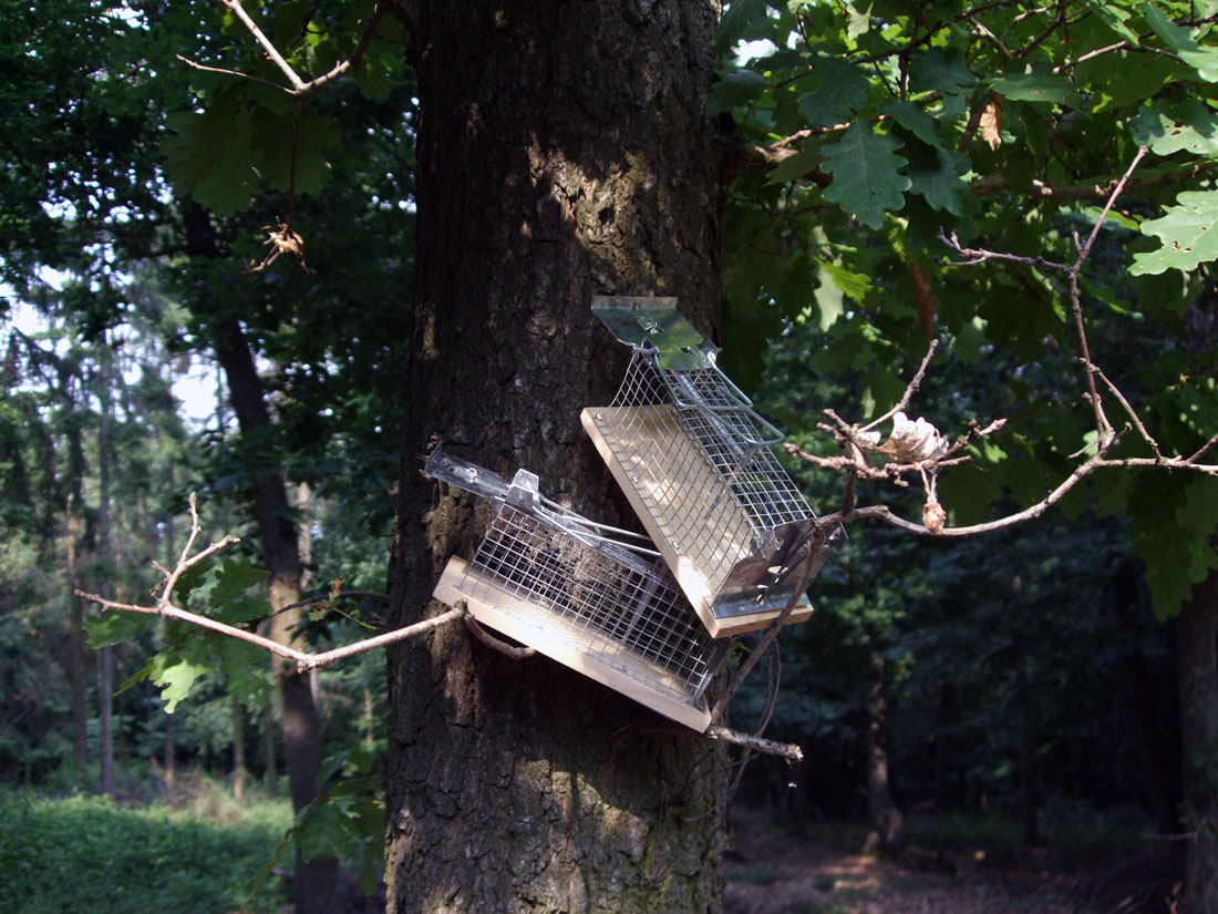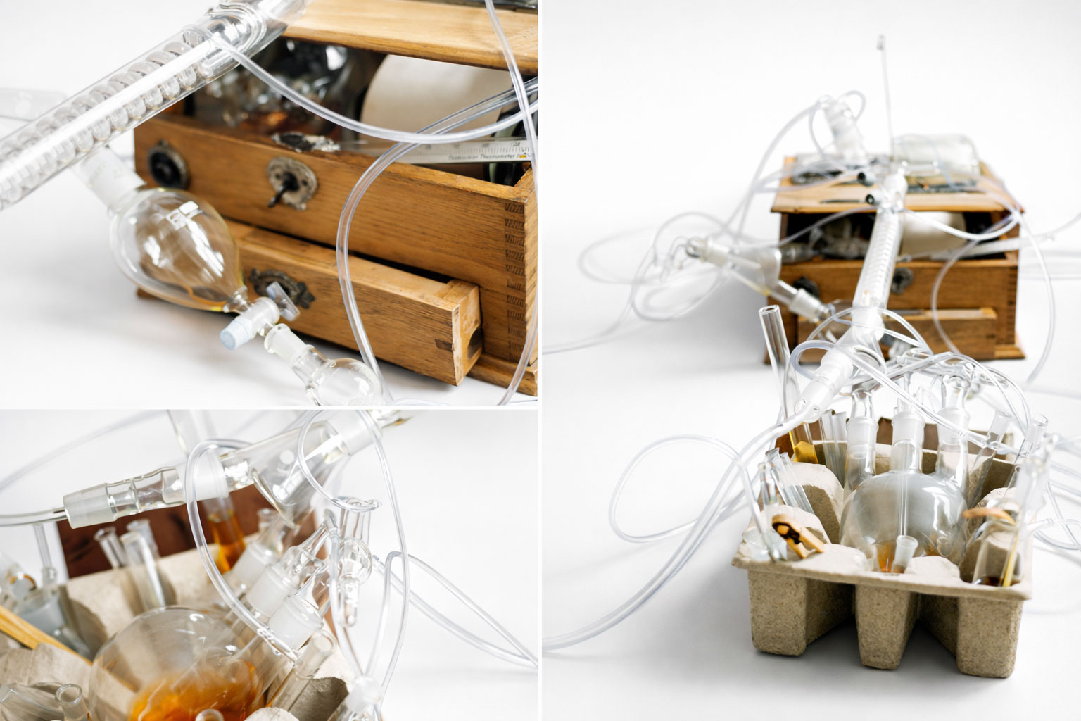 In this experiment drops of the artist’s extracted DNA were placed inside mechanical insect traps attached to a tree. The traps remained closed for approximately three hours, temporarily enclosing the biological material within devices normally designed to capture living organisms.