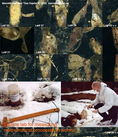 For the work, Mercado printed Chapter 17 of Karl Marx’s Das Kapital and fed the paper to earthworms. After the worms had digested the material, the artist extracted DNA from the organisms that had metabolized the printed text. The worms thus became biological intermediaries in a process where theoretical discourse was transformed into organic matter.