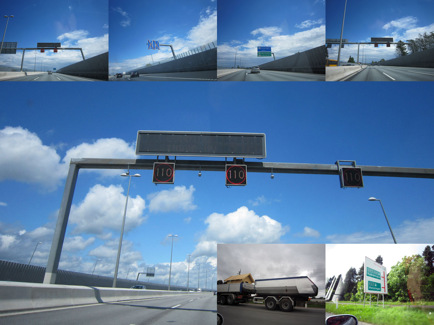 The highway signs that appear repeatedly in the photographs function almost like fragments of a new notation system. Each sign points toward Helsingør, gradually transforming the act of travel into a kind of performative score.