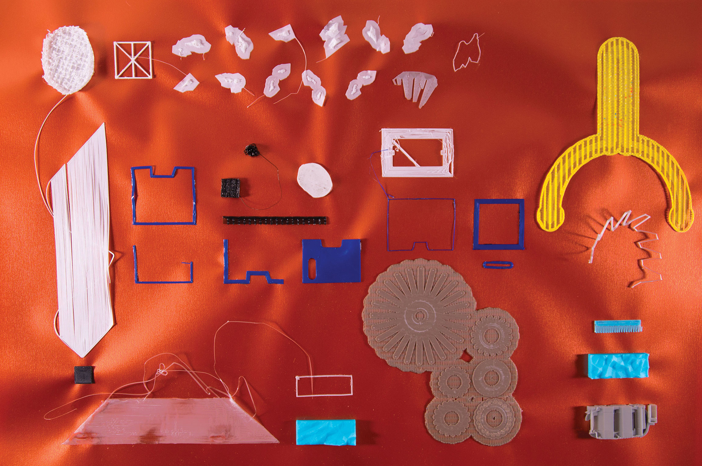 copper-coloured 3D-printing errors (glitches) and fabrication remains