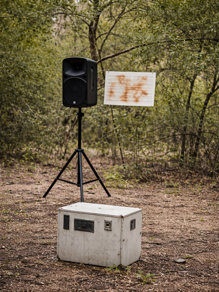 Speakers powered by a portable generator were distributed among trees, while the graphic scores were placed on branches and provisional supports.