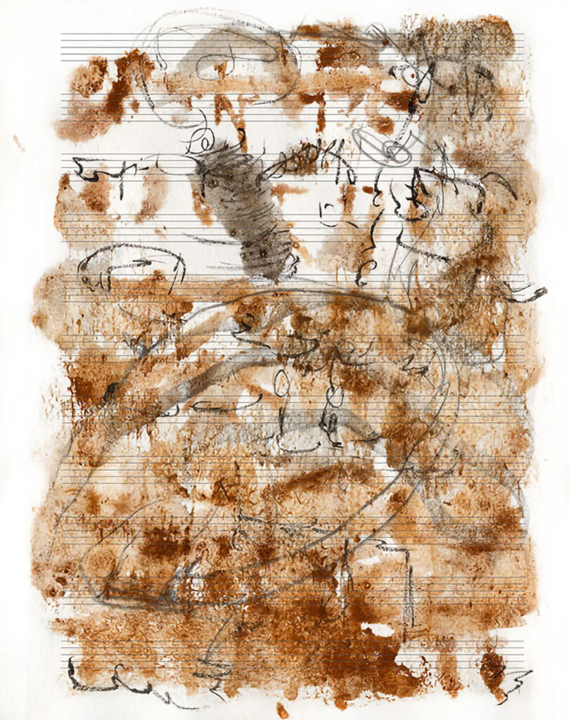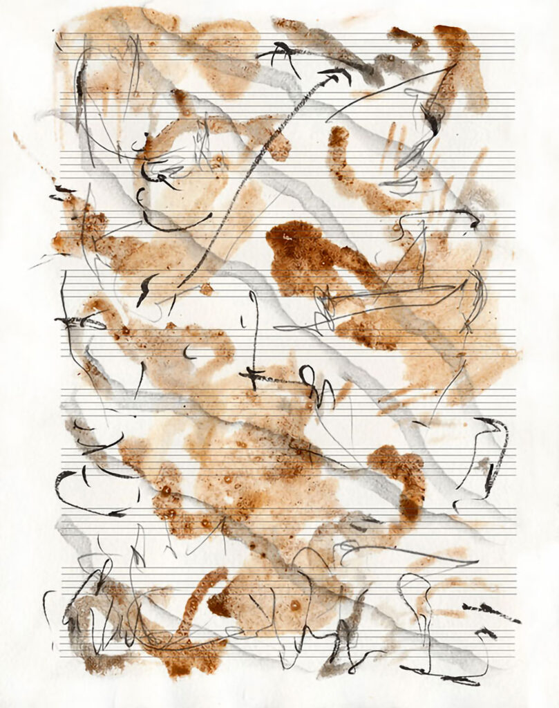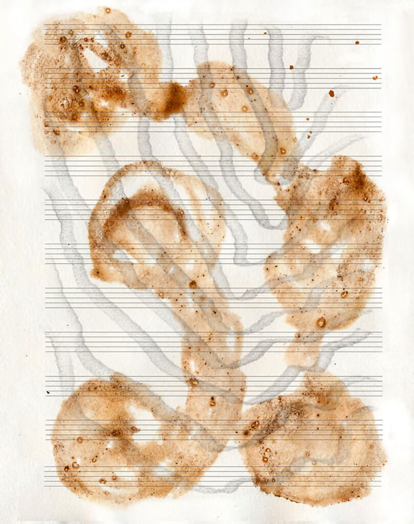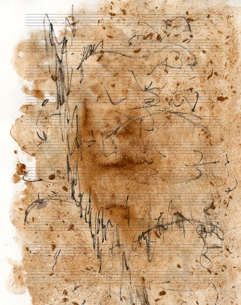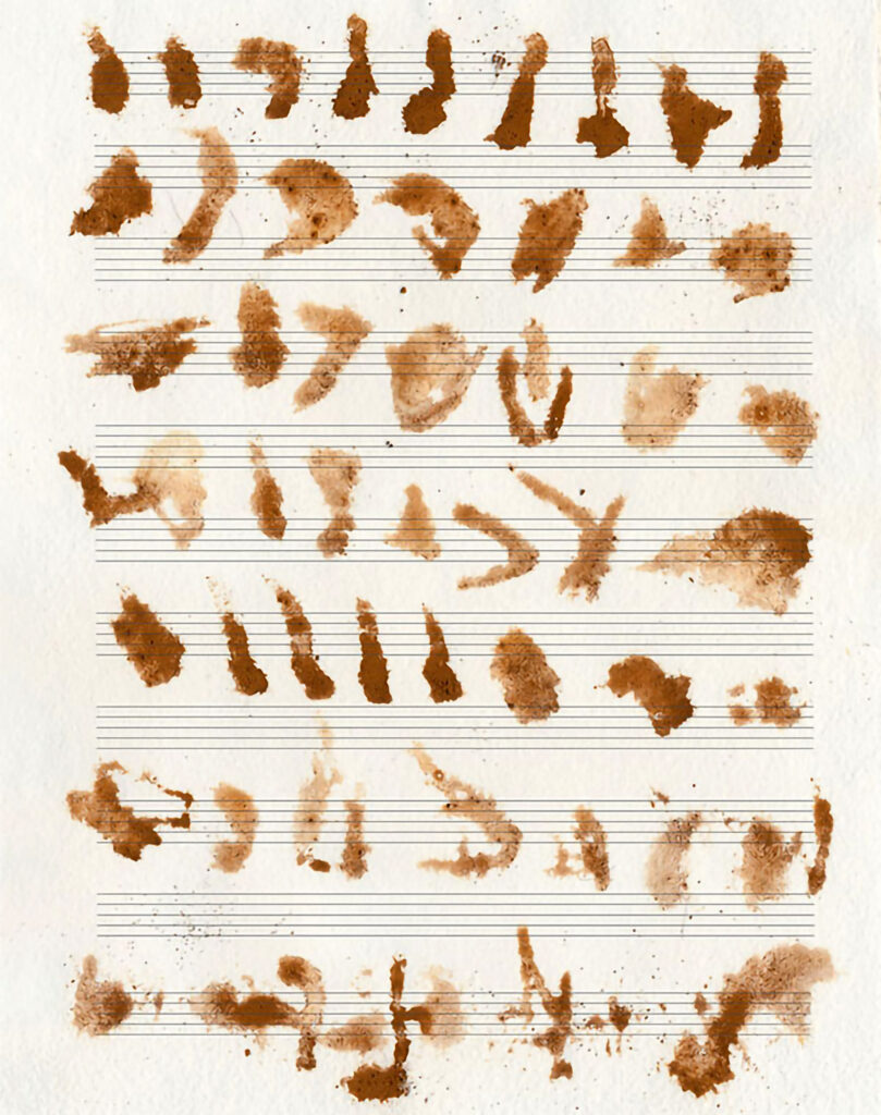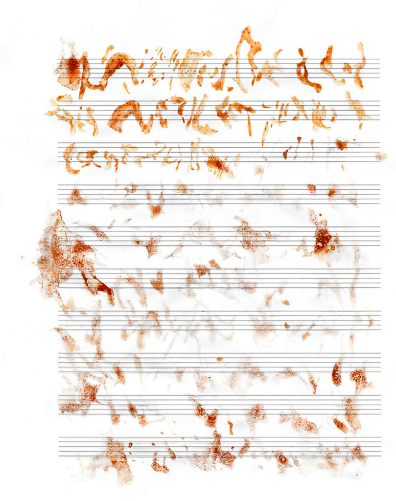 Fragments of oxidized residue were scanned with mobile devices to produce initial sound data; the same material was later pulverized, mixed with water and applied to paper staves, generating graphic scores. These sheets were subsequently re-scanned, producing unstable translations between mineral surface, optical code and acoustic output.