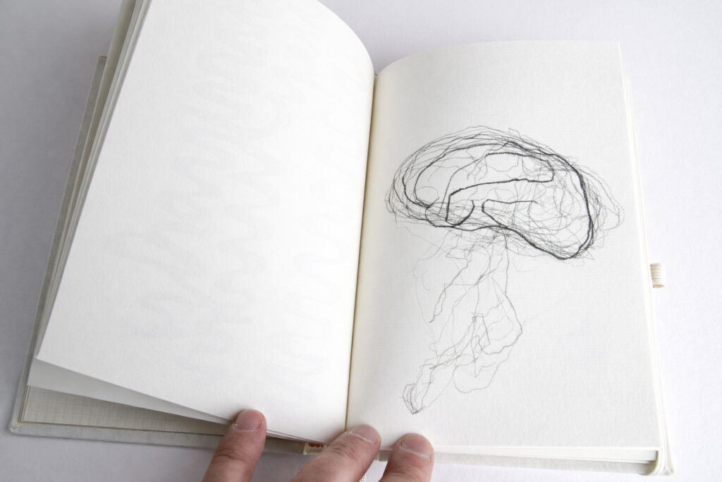 En Metacartografía (Metakartierung), libro de artista realizado en 2010, el dibujo se convierte en una operación cartográfica especulativa. Las páginas reúnen trazos lineales, impresiones difusas y capas de grafito que evocan diagramas neurológicos, registros sísmicos o líneas costeras en deriva, pero que finalmente resisten cualquier identificación estable. No se trata de cartografiar un territorio externo, sino de someter al propio acto de mapear a una exploración reflexiva: sus vacilaciones, reiteraciones y fallas.